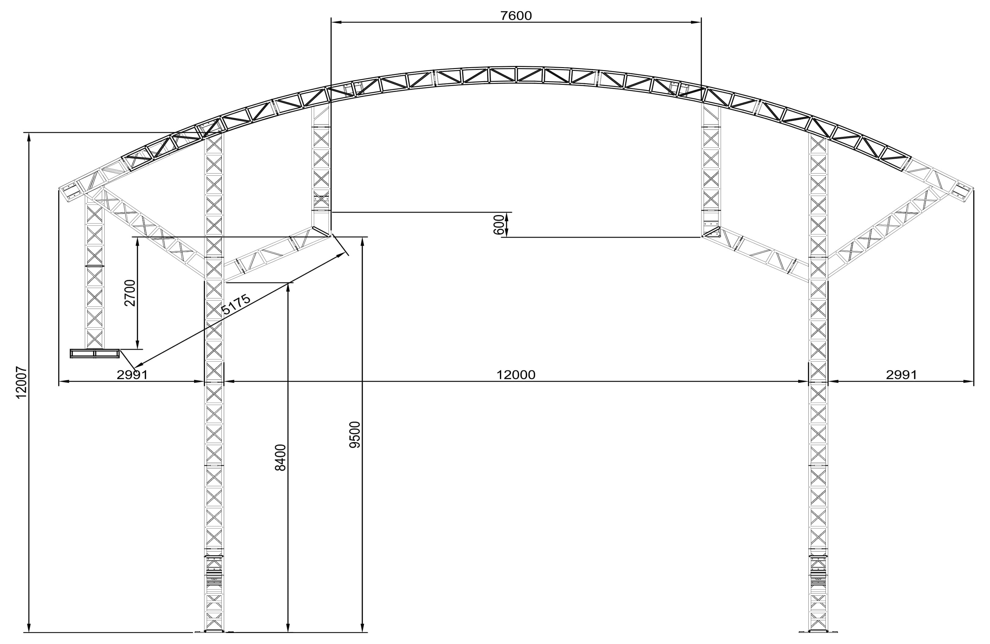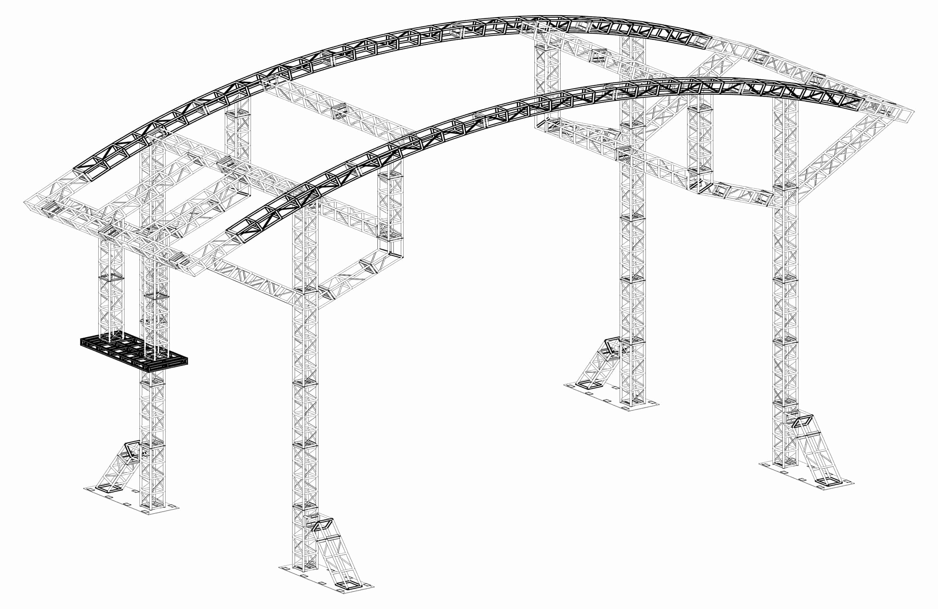 Esta estructura de celosía curva de 18 m x 5 m x 12 m está diseñada para espectáculos acrobáticos. Según los requisitos del cliente, el lado izquierdo de la estructura debe ser 60 cm más alto que el derecho, y las piezas colgantes a ambos lados deben estar separadas 8 m.
